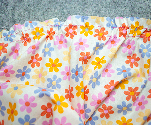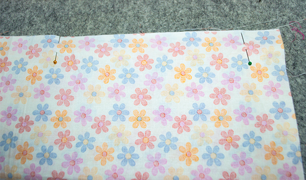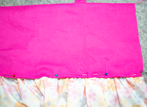 Start by placing the top pieces right sides together. Clip using wonder clips or pin. You may have to play around with this to get the straps where you want them. I measured in 4 3/4″ from each short end. Fold the two top pieces in half and place two straps on one short side. One of the straps will be attached to the front and one of the straps was placed on what will be the back of the dress. and two straps on the other side between the two top pieces. You will need to re-clip or pin all layers. Stitch along the long edge where the straps are using a 1/2″ seam allowance. Turn right sides out and press well.