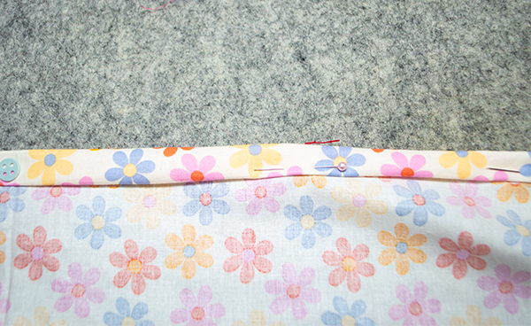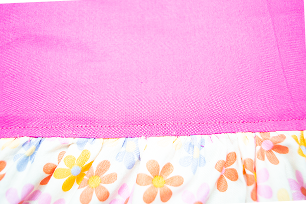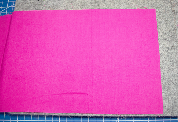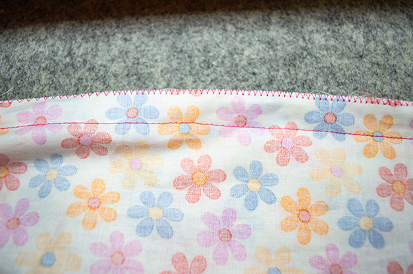 Fold the entire piece right sides together and stitch the side using a 1/2″ seam allowance. Make sure that the join of the top and the bottom are matched. Finish the seam with a serger or a zig zag stitch to prevent fraying.
