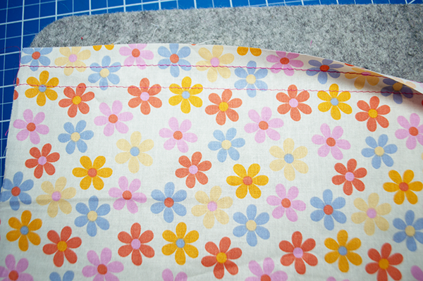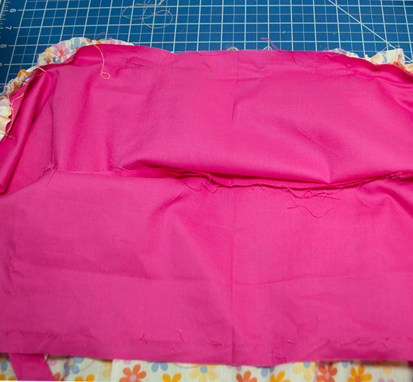 Place the top right sides together with the bottom matching the raw edges. Stitch the pieces together using a 1/2″ seam allowance. Press the seam up toward the top. Fold the top lining piece under at the bottom enclosing the raw edges. Stitch the folded under edge through all layers.