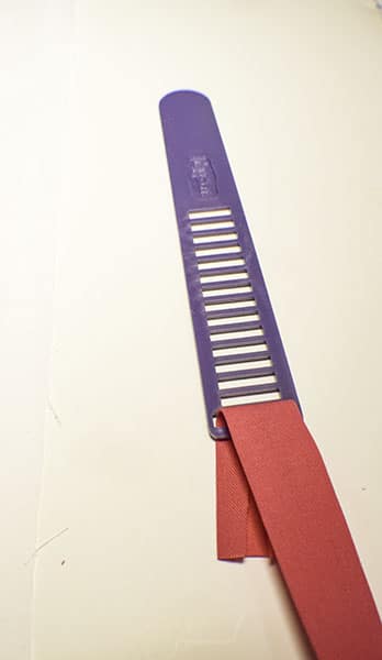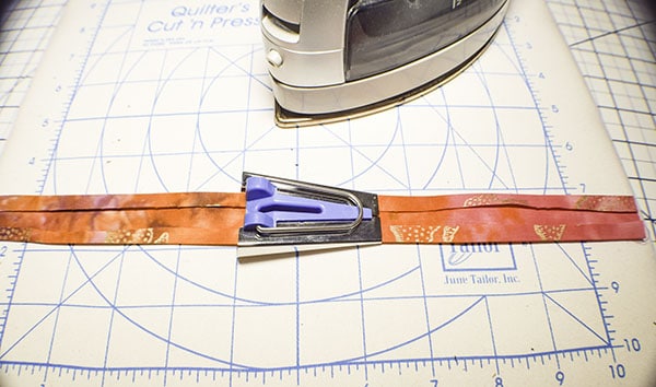Take each of the strips and feed them through the bias tape maker. Â By doing this you will fold the raw edges inward leaving both edges folded. Â