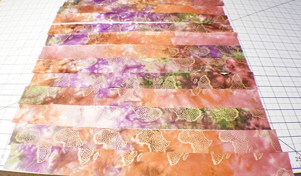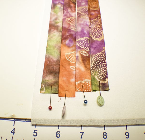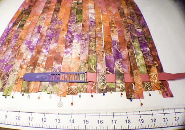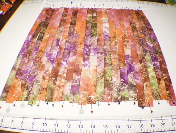 Take your first main fabric strip and place it 2″ down from the top of the interfacing and horizontal.  Place a pin diagonally into the strip and foam board on each end to hold it in place.  Place the the next main fabric piece right next to the first securing it in the same way.  Continue until you have placed all 16 strips. Â