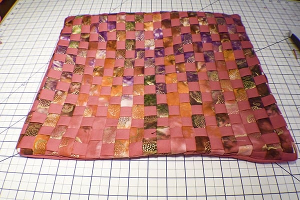 Carefully remove the weave and interfacing from the board by removing the pins.  Press throughly so that the interfacing fuses to the backside of the woven panel. Once the panel and interfacing has fused trim the square to the 16″ x 16″ dimension and stitch around the perimeter of the panel to further secure the weave.Â