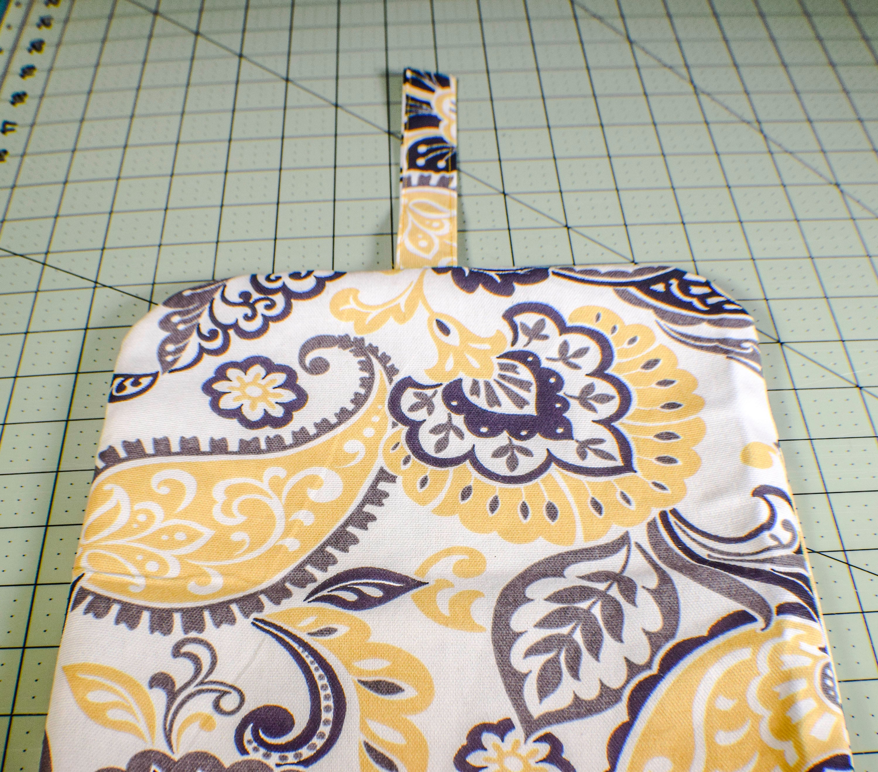 Sew the front outer to the back and the front lining to the back by sewing the sides and the bottoms only. Leave the cut out squares unsewn. Leave a fairly large opening in the lining bottom for turning the bag and for inserting the padding. Once the sides and the bottoms are sewn you will box the corners. Take the side seam and the bottom seam and match them up. The raw edges of the box that you cut will lay flat. Measure down so that the seam is 5″ long and sew across the raw edges.