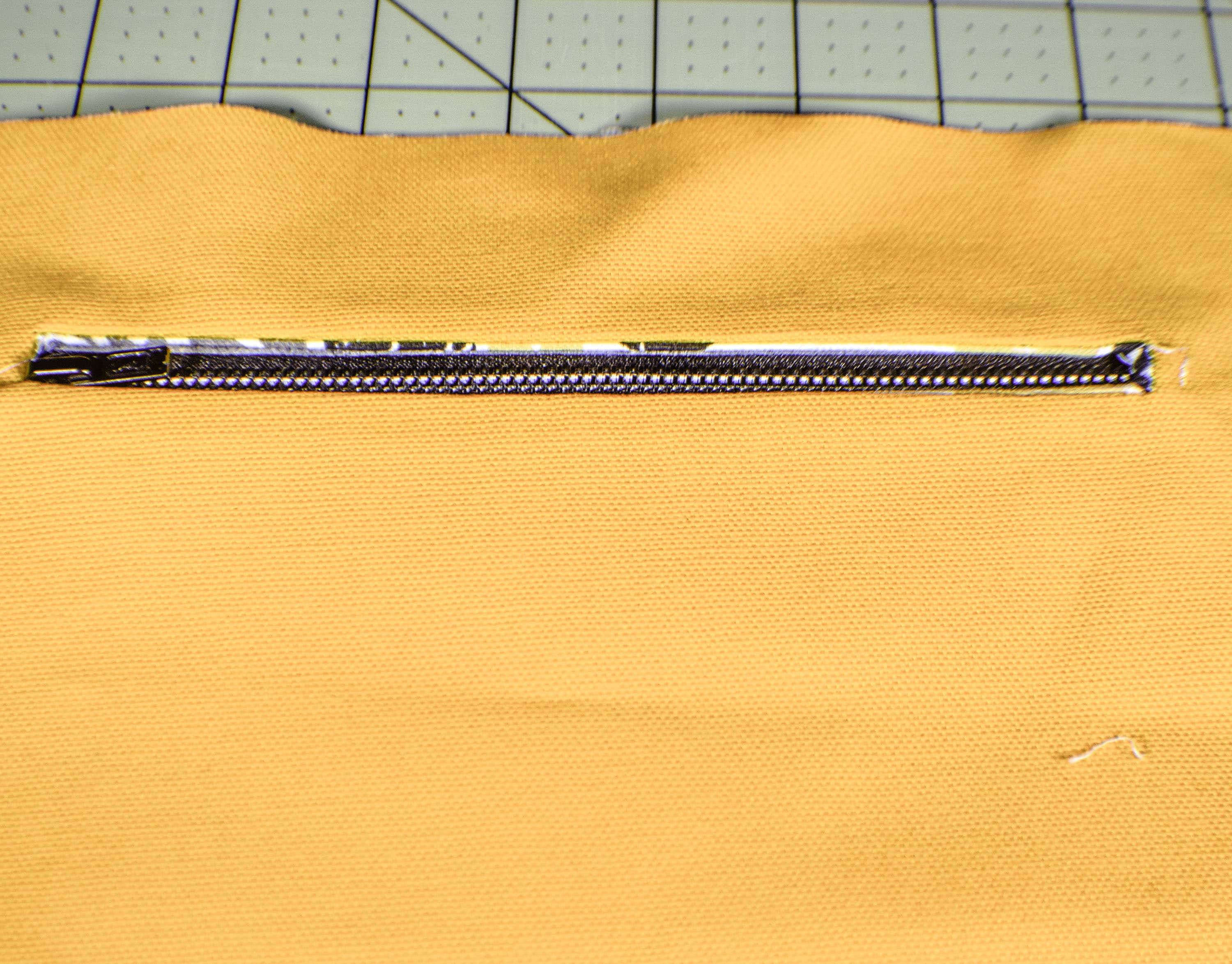 Choose one of the rectangles to be the back of the bag. You will insert a zipper pocket to this side of the bag. I chose a contrasting colored metal zipper as an additional accent to my bag but you could use a nylon zipper if want. I did not have a 9″ zipper on hand but I did have a 22″ zipper that I shortened. If you have never shortened a metal zipper before follow my tutorial on how to shorten a metal zipper and learn how.